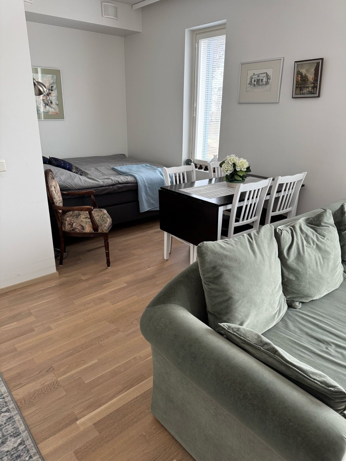 A quiet and cozy studio apartment upstairs in an old front-line soldier's house, with its own entrance. The apartment is well suited for event guests, business travelers and anyone who needs cozy accommodation in a quiet environment. Private entrance and parking make it easier to operate. The apartment is only about a 10-minute walk from Tampere Exhibition and Sports Centre. Buses number 30 and 32 to the center of Tampere run next door, and the travel time is about 15 minutes.