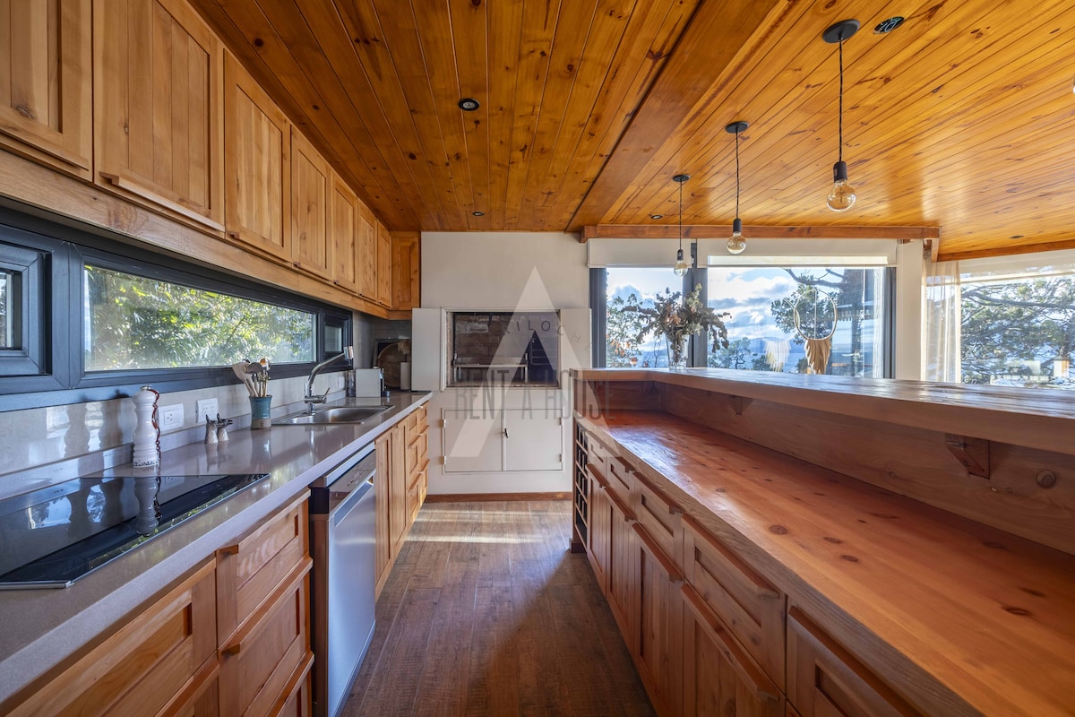 The charm of this house is immediately upon entering this modern space full of life, bathed in sun and light. The living room, dining room and fully equipped kitchen share a completely open space with stunning views of Lake Nahuel Huapi. The wooden deck is the perfect place to enjoy a magnificent patagonian sunset. THERE IS NO PROTECTION FOR BABIES/CHILDREN AT THE INTERIOR STAIRS AND BOTH EXTERIOR DECKS.