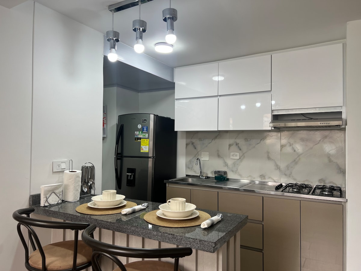 Enjoy a comfortable stay in a modern, clean and private apartment while doing tourism or work activities in Manizales or Villamaría. The apartment has style, modern and comfortable furniture, for an exceptional stay. It's interior, which reduces street noise. It has all the amenities such as hot water, Television, Wi-Fi Internet, kitchen items and a refrigerator, with enough space. Located at the entrance to Villamaria, close to everything.