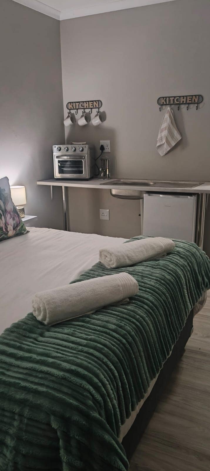 The Luxury Studio features a queen-sized bed and an en-suite bathroom. Enjoy Wi-Fi, air-conditioning, and a smart TV with DStv and Netflix. A well-equipped kitchenette with a gas burner, microwave, and fridge adds convenience to your stay.