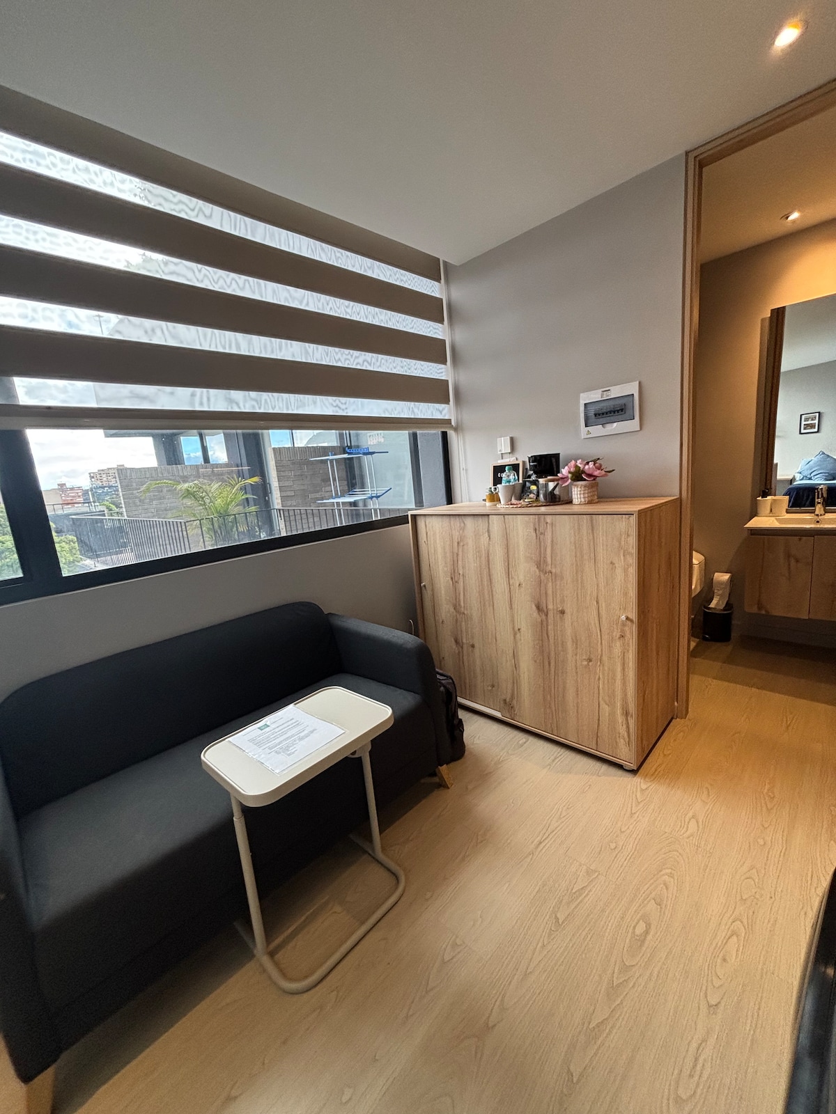 Charming suite in the heart of Bgtá, ideal for couples or travelers. Elegant decor, equipped kitchen and comfortable double bed. Private balcony with stunning views, Social Areas such as Laundry Area, gym, pool table and ping-pong, CoWo, BBQ terrace on the top floor with 360° view and 24-hour security. Close to markets, museums, restaurants in La Macarena, Monserrate, La Candelaria, Mall San Martín and the International Center. Discover the best of Bogotá from this wonderful Suite!