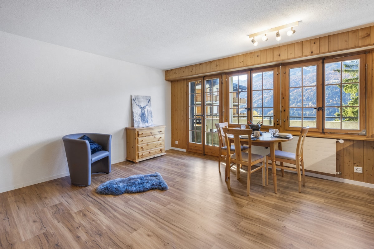 Bright 3-room apartment in a small chalet of 3 dwellings at 5 minutes walking distance from the funicular and the village centre. Drop off your car at your arrival on the included parking spot, no need anymore. You have a breathtaking view of the peaks of the Val d'Anniviers from the terrace. Ideal for 4 people, possible up to 6 (2 extra beds for children). Kitchen, windows and heating completely renovated for optimal confort.