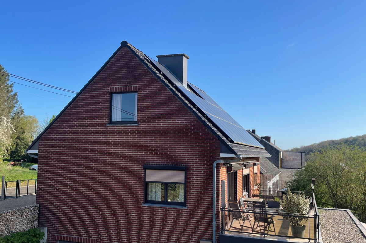 Pleasant, luxury, warm, comfortable cottage, surrounded by nature with a beautiful view of the Ardennes, large private garden with swing, private parking in front of the house. New high speed wifi. Last house at the top of a pretty little village, on a dead end road, 150 m from the forest. Perfect for walks. For 2 adults and possibility of 1 child and 1 baby. 1 hour 15 minutes from Brussels, Liège, Lux. 4km from the Meuse valley. Tennis!! under construction. Spa pool 15' Golf 12'..