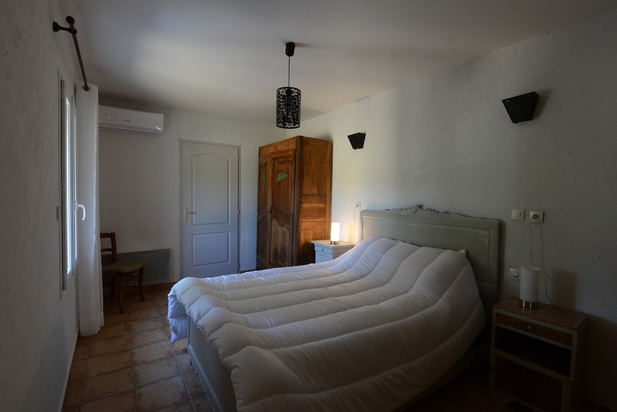 In a farmhouse with character, this independent apartment of about 65 m² was renovated in 2021. Private access through the farmyard. Equipped kitchen with direct access to the terrace, dining room with fireplace and TV, bathroom with walk-in shower, Provençal bedroom with restored furniture (140 cm bed). Charming view, air-conditioned apartment. Access to the owners' pool. Private parking.
