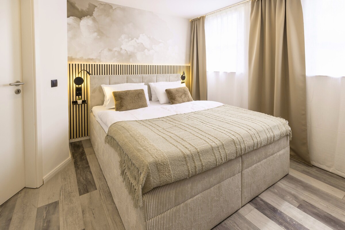The luxurious Essenz Apartment in Hof offers maximum comfort for solo travelers, couples or business travelers on 25 m². Highlights include the king-size box spring bed, a walk-in rain shower, a 55-inch TV with streaming services, a productive workspace and super-fast Wi-Fi (330 Mbps). Free private parking right in front of the house is also included. Clever design with custom-made furniture and a small refreshment corner complete your stylish stay.