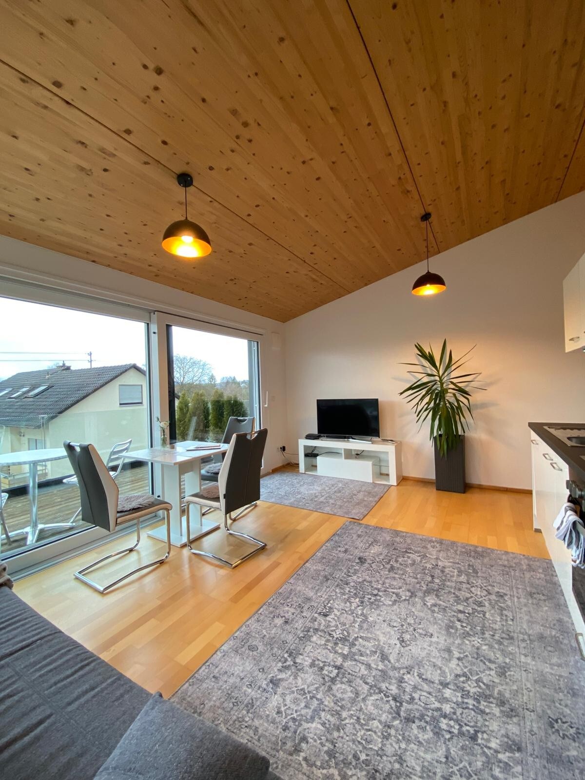 Wellcome in our modern furnished DG apartment with beautiful views of the Hegauberge. An approximately 80 square meter and bright apartment awaits you: with fitted kitchen (including dishwasher, electric stove with oven, fridge/freezer and coffee maker); large living room with TV and dining area and a covered balcony; large bedroom with double bed and single bed (if necessary also a baby crib); small bathroom with shower and toilet.