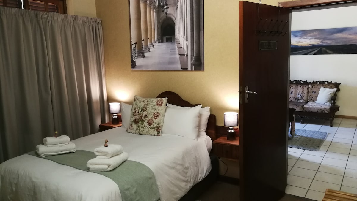 Gerieflik en sentraal in die dorp, stapafstand vanaf meeste besienswaardighede. Veilige parkering in toesluit motorhuis. Kom geniet hierdie ruim selfsorg woonstel met groot leefarea, aparte slaapkamer met en-suite badkamer. Gratis WiFi. Die Bankbestuurder-eenheid het sy oorsprong as amptelike bestuurderskantoor van die ou Volkskas Bank wat in hierdie gebou handel gedryf het. Die gebou is intussen in woonstelle omskep waarvan hierdie een die oorspronklike hoofingang gebruik.