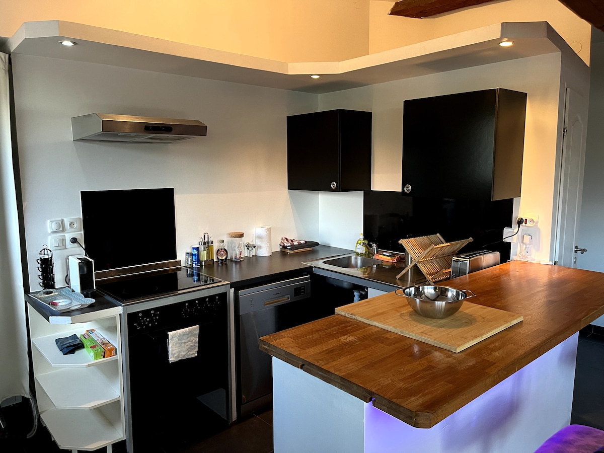 This atypical studio offers a separate entrance on the ground floor with storage, washing machine/dryer and cupboards. Upstairs is a beautiful bright, modern and colorful space. The kitchen is perfectly equipped (stovetop, fridge, microwave, coffee machine, toaster, full dishes). You will also find a sleeping area with a super practical foldaway bed, a modern shower room with separate toilet. For your evenings, a video projector awaits you for a cozy movie at home.