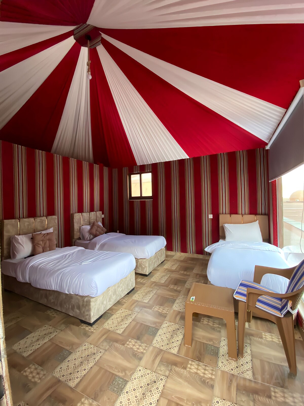 Spend a night in a luxury Bedouin Tent in the heart of Wadi Rum Desert This luxury Tent consists of 3 single sized bed in a private room with bathroom and a panoramic window that lead to the private terrace with a amazing view on the desert. You will be provided with towels, shampoo and free water. It includes breakfast in the commom room. The transfer from the village is 10JD/person if you don't book a tour with us.