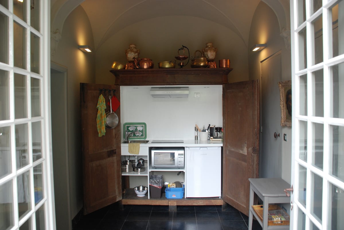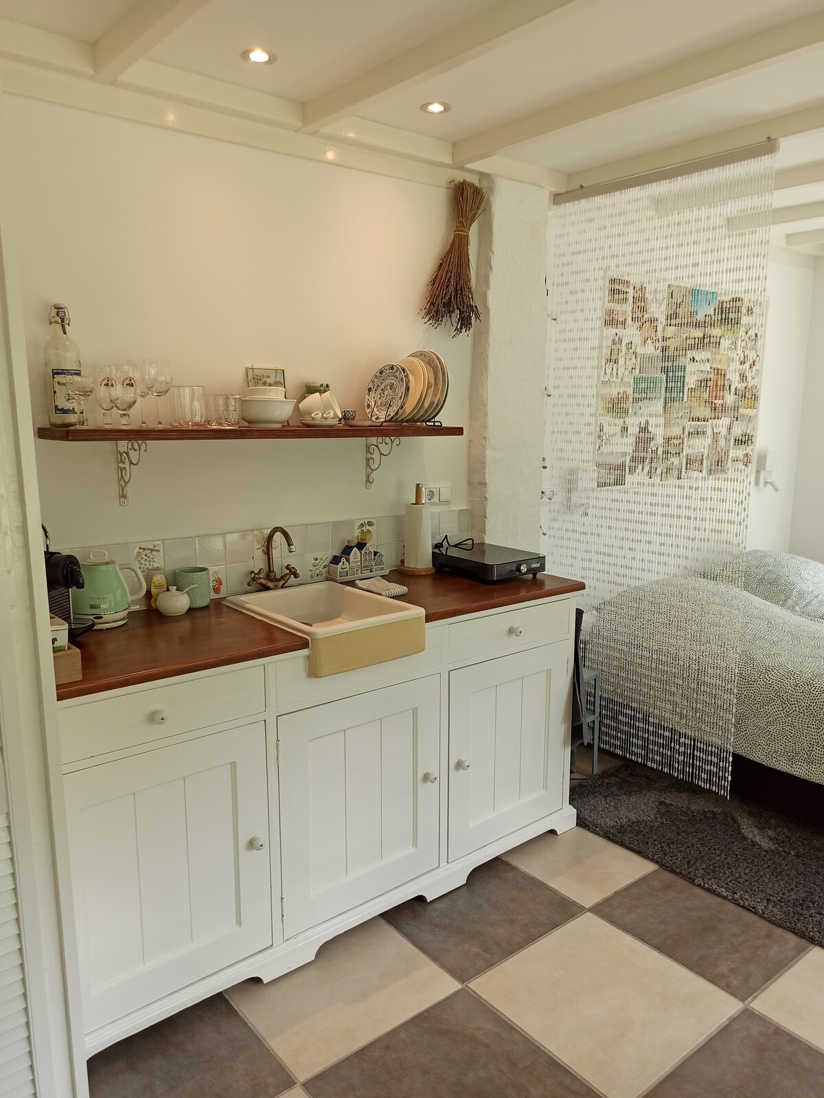 A compact tasteful sitting room dining area with a beautiful view. A kitchenette with fridge induction plate Nespresso and microwave. Basic ingredients provided (coffee tea pepper salt oil vinegar). Private toilet. At the back terrace doors (also entrance) private garden (on SW) veranda and 2nd terrace (dining table, 2 sun loungers and gas BBQ). From the living room staircase to floor with bright luxurious bedroom king bed modern bathroom, shower and double sink. Very quiet and 1.5km from Domburg and beach!