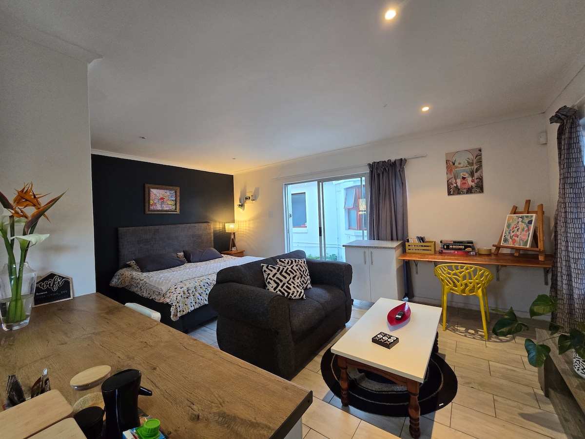 Ideal for short stays. Secure off-street parking. Convenient position - 5 mins from Airport, St George's Park, Grey schools. 7 mins to Beachfront. 35 mins to Addo Elephant Park. Located in the garden of a family home and the owner's art studio. Full en-suite bathroom the kitchenette has a kettle, microwave and fridge. Queen double bed, free Wifi, solar electricity and independent water supply. Cafés, shopping centre within 5 minutes walking distance.