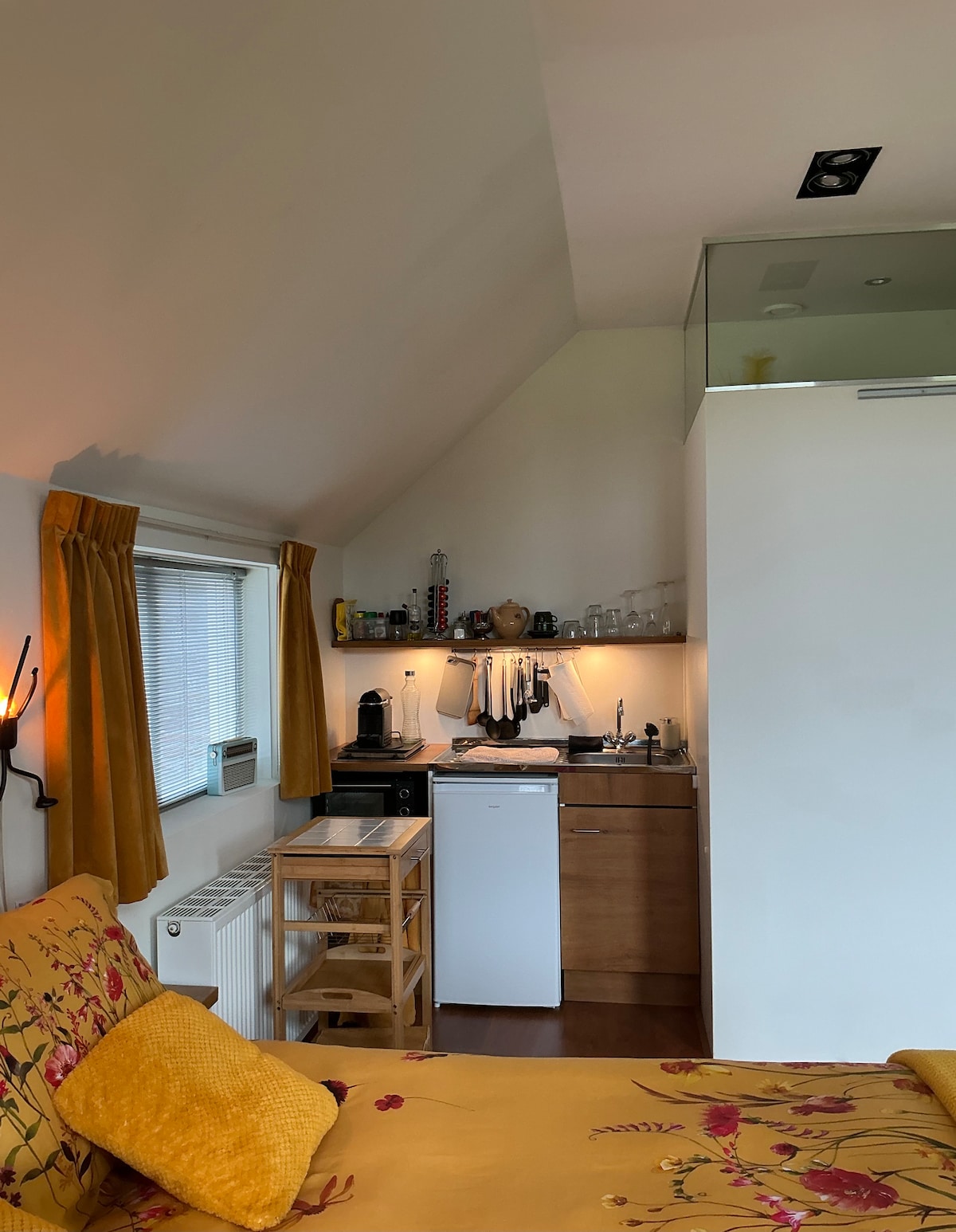 The Front House of our national monumental farmhouse has been renovated into a full luxury suite with its own amenities. The original details, such as the high ceilings, the bedstee walls and even an original bedstee you can sleep in, have been preserved. No less than 65m2 with its own kitchen, spacious living room and separate bedroom with freestanding bath. Toilet and spacious walk-in shower. With the option to use the hot tub, sauna and outdoor shower at an additional cost, you can relax wonderfully.