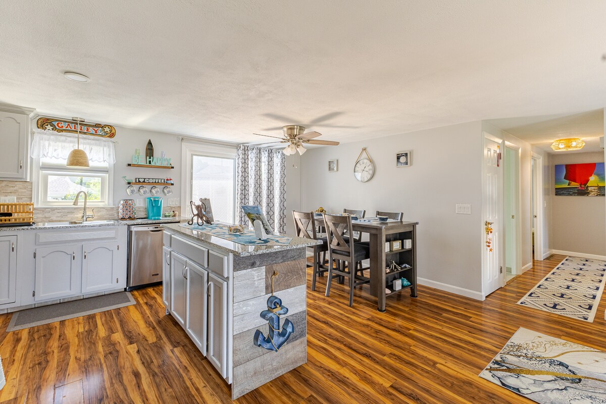 Fully stocked family kitchen. Fantastic views of Narragansett Bay from the front of the home, watch the beautiful sunset and sunrise Walk to the beach and park area at the end of the street. Newly remodeled 3 bed, 2 baths home, decorated and furnished with a quaint, whimsical, nautical Octopus theme throughout. Lower level has a cozy den area with a full bath Located within 12 minutes to T. F. Green Airport, 15 minutes to Providence, (local colleges) and 45 mins. to beautiful Newport, RI.