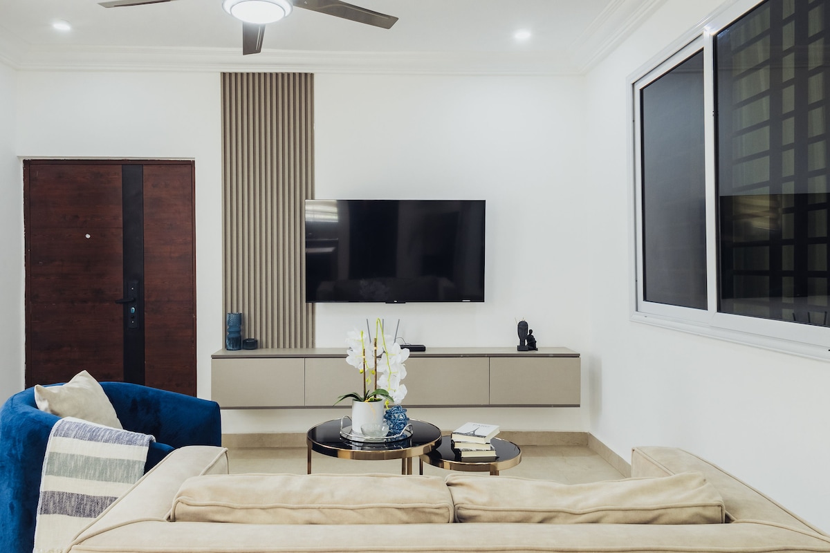 This modern, full-service, family-friendly 2-bedroom apartment with 2.5 bathrooms offers a private rooftop swimming pool and an exclusive rooftop bar and grill for families or guests. Located in the heart of Takoradi’s Anaji area, the property features a fully-equipped kitchen and dining area, complete with an island perfect for cooking, working or entertaining. The living room is outfitted with a 75" Smart TV, Netflix, Wi-Fi, executive working desk, and a soundbar for your entertainment.