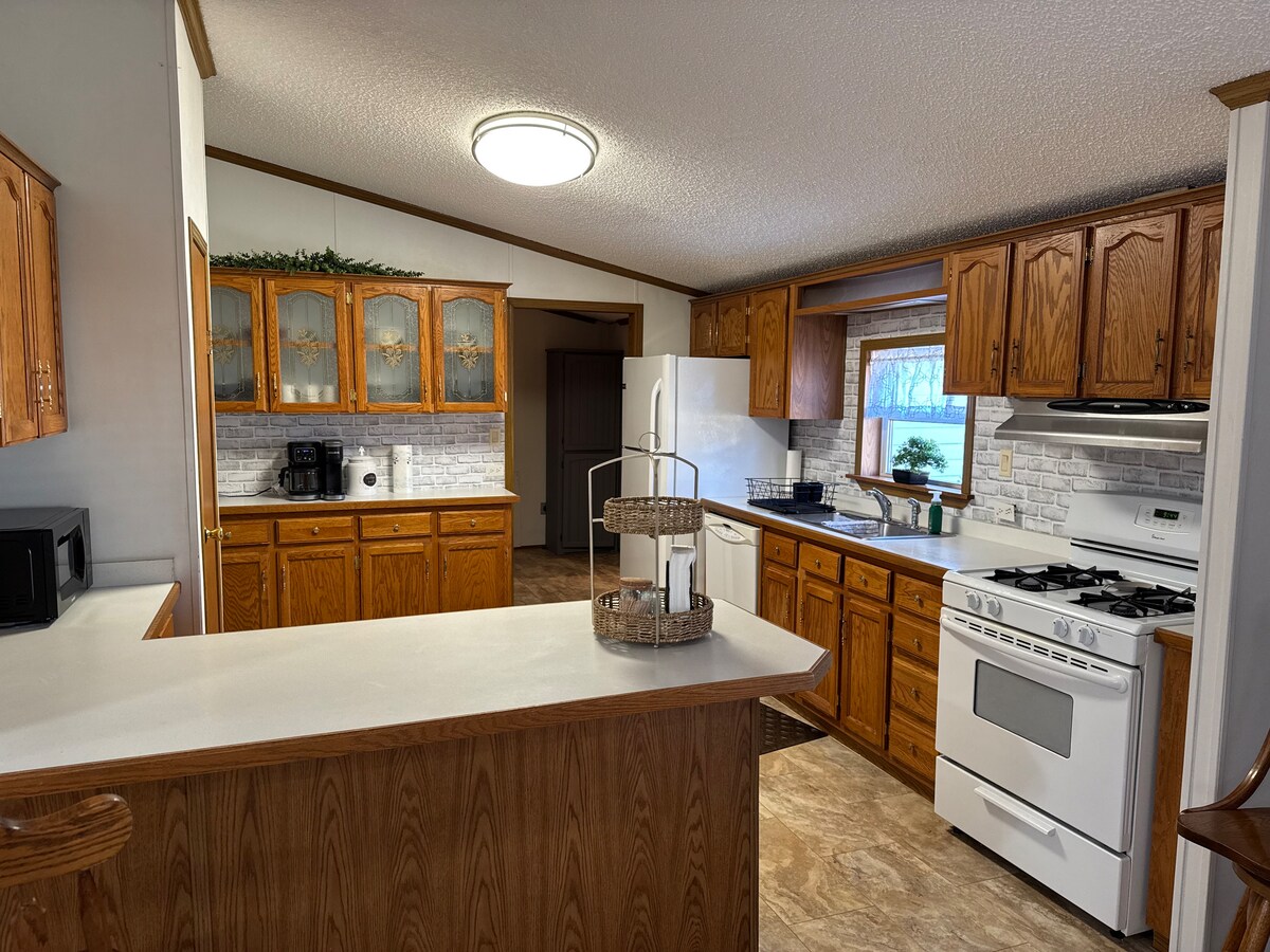 We have a 2000 sq. ft. home located on 3 acres in a very country setting. It has 3 bedrooms, 2 baths, master bed room has queen size bed, second bedroom has full size bed and third bedroom has 2 twin beds. Large master bath with large soaking tub and shower. Spacious kitchen is set up to cook if you like, . The back porch over looks the woods and fields with lots of deer siting. Our location is very quit and peaceful. also there is a garage you have access to.