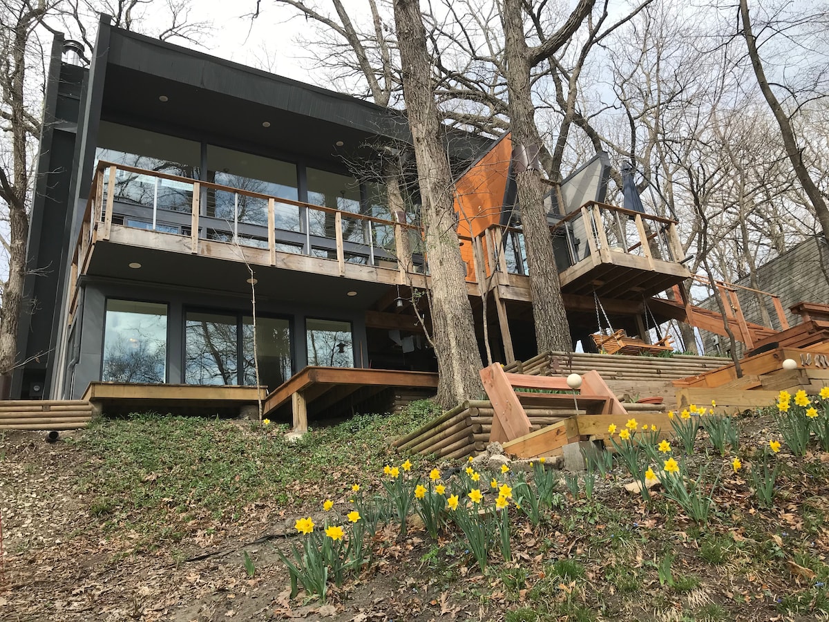 Indulge in this luxurious, light-filled, architecturally unique, and tranquil house, nearby the university. Marvel in this 3-level spacious house w/ 3-level decks and terraced garden at the edge of the woods/park. Enjoy evening outdoor fire bowl, watch birds, deer, and other wildlife, & stroll down deer trails to Clear Creek. min. stay 2 nights. No window shades! Not for dark bedroom sleep. Not w/chair accessible. not for guests with woods-related allergies. $25/night for each guest after two.