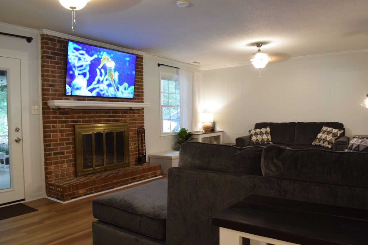 Entire street level (2400 sq ft) midcentury duplex with private entrances on a full acre in downtown Fort Mill restaurants and shops. Indoor stone fireplace; outdoor deck with fire pit; garden; washer & dryer; pianos; sunroom; kitchen with quartz counters. Ample parking; front porch swing; natural outdoor areas. May accommodate small gatherings, Scouts and teams with approval. 1 block from Walmart center & restaurants. Carowinds 8 miles; Velodrome/Catawba River access at Riverwalk 4 miles.