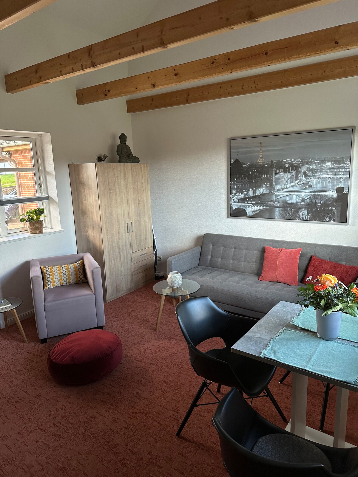 Söhren in the municipality of Weede is quiet but central. It is about 10 km to Bad Segeberg, 25 km to Lübeck and about 30 km to the Baltic Sea. On the upper floor of a detached house, you will find 1 bedroom with a large double bed, a living room with a pull-out sofa bed (2 people), a kitchenette and dining table as well as a bathroom with shower. Unfortunately, there are no shops or places to eat here. Are you traveling with children? No problem: a crib and high chair can be provided.
