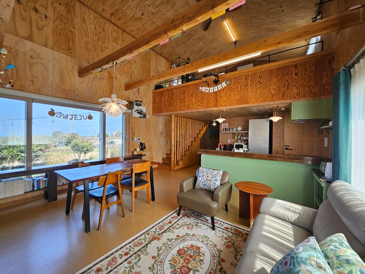 Come to relieve your complicated mind. I left it empty so that I wouldn't have any complicated thoughts. You need a moment to empty your mind, whether it's a busy trip or an empty one. Thanks to you, we've created a comfortable space to clear your mind while you rest. I took out most of it and left only the scenery of Jeju. Four large windows on the west and south sides contain a wide tangerine field. While cooking in the kitchen, while reading a book, You can see the tangerine field that changes quietly every moment while drinking coffee. The kitchen is spacious so that you can fill your empty heart with delicious food. A room where you can hear the night sounds of the tangerine field, but no noise. Fluffy bedding is available. Plenty of towels. Warmth is a given. There's nothing special, but I've got just what you need in the bathroom. Hamdeok Beach, mart, and convenience store are 5 minutes away by car, so you can be quiet at any time, and you can get what you want if you want.