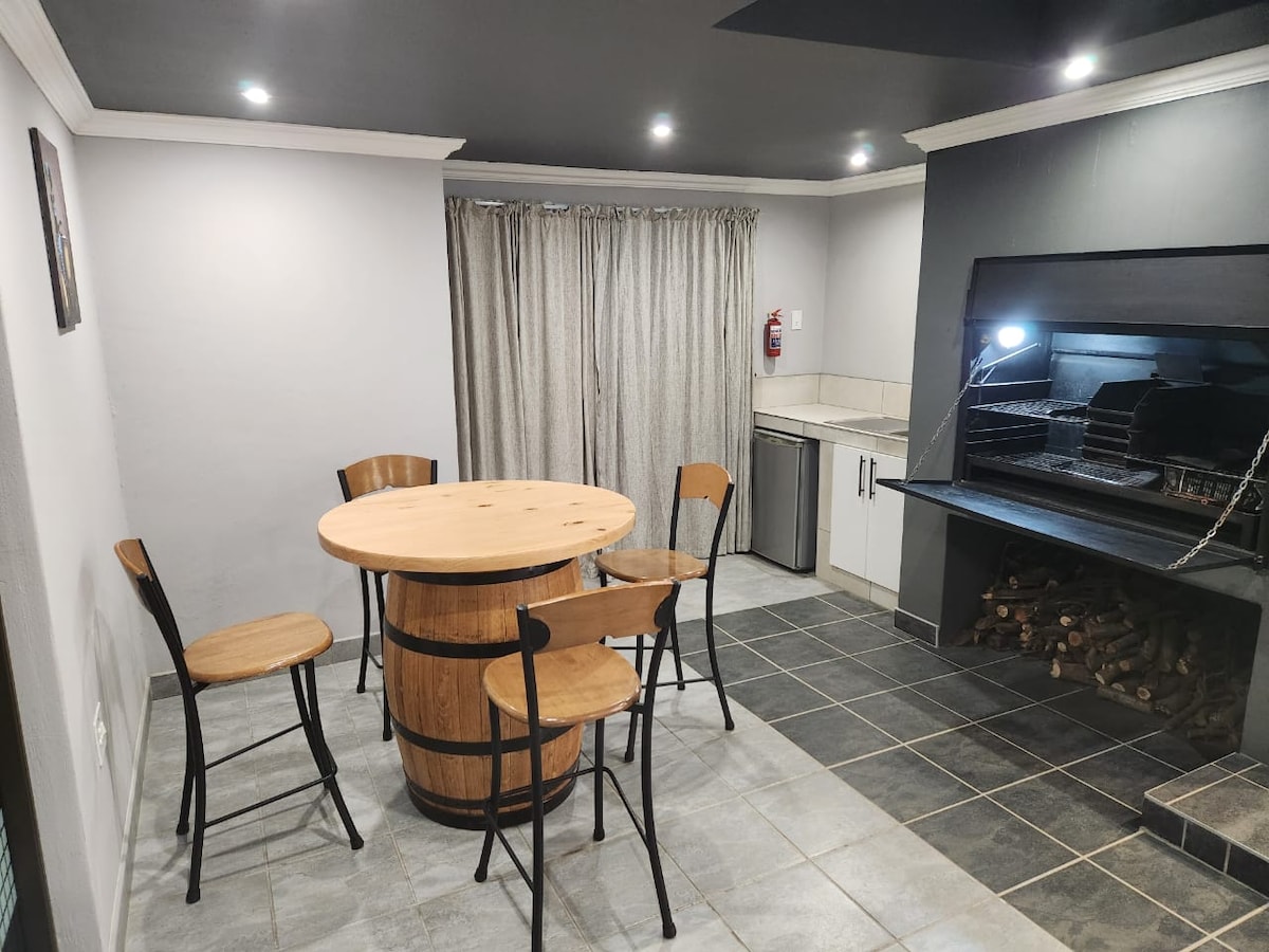 Experience luxury and coziness in this walled unit promising peace of mind with its armed night security & free parking. Enjoy a fully fitted open-plan kitchen, 2 spacious bathrooms, dining area & living room with a fireplace & a 55-inchTV. Two spacious bedrooms include a main suite with a study nook & a 42-inchTV. Relax in the indoor barbecue/braai room with a wood-burning stove, bar fridge, & sink. Uncapped WiFi, DSTV, & Netflix add to the comfort. The unit is in a complex of 4 private units.