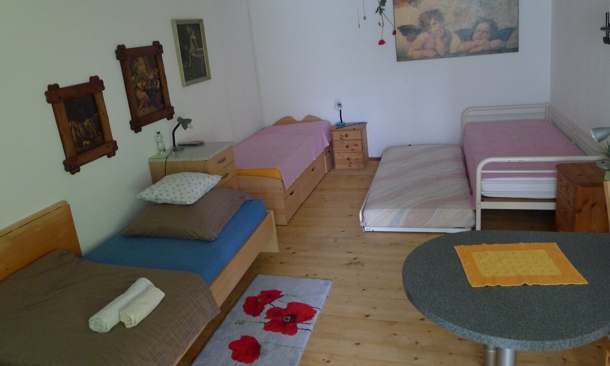 Our basement apartment is ideal for solo travelers or business people looking for a cozy temporary home. It offers one bedroom, a living room, a separate kitchen and a private bathroom. Outside there is a seating area – perfect for relaxing in the fresh air. In the hallway there is a dresser, in the bedroom a wardrobe. In the living area you will find a desk for working and a sideboard with TV. Of course, Wi-Fi is free.