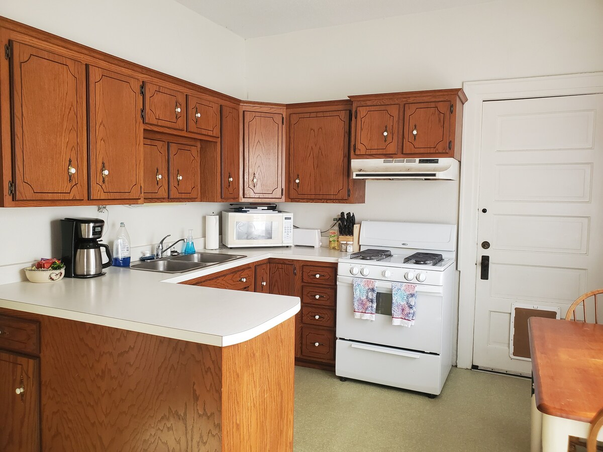 Your family will be close to everything when you stay at this centrally-located duplex. Set up to make your stay stress free, we are stocked with all your travel needs. This duplex offers 3 queen beds, (one main level and 2 second floor), an easy step in shower, entry ramp, pet friendly with fenced in back yard, WiFi, games, and all your basic kitchen needs! Enjoy a view of dry run creek reflecting the nearby railway. This home is a duplex that is completely separated from the second unit.