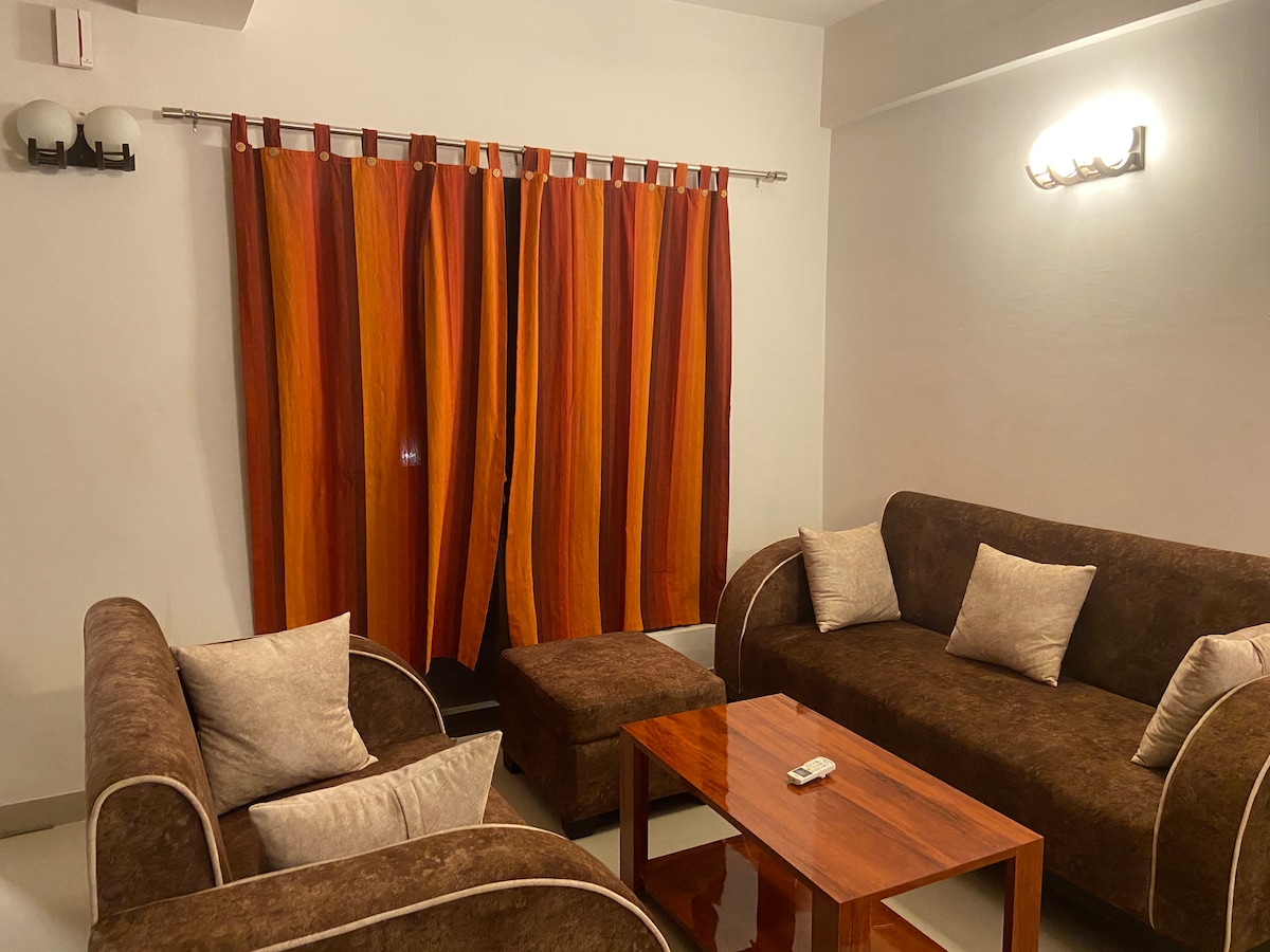 The apartment will be on the 15th floor with an breathtaking view, 2 bedrooms with air conditioners and 32inch android/smart TVs, 2 balconies with beautiful artificial gardens,1 fully modular kitchen along with water purifier, there is a washing machine for the convenience of long term stay, there is a 5 seater sofa and 4 seater dining table, 55inch android/smart tv, you'll get an unlimited wi fi service. There are two well equipped washrooms with geysers. we also provide 1 free parking