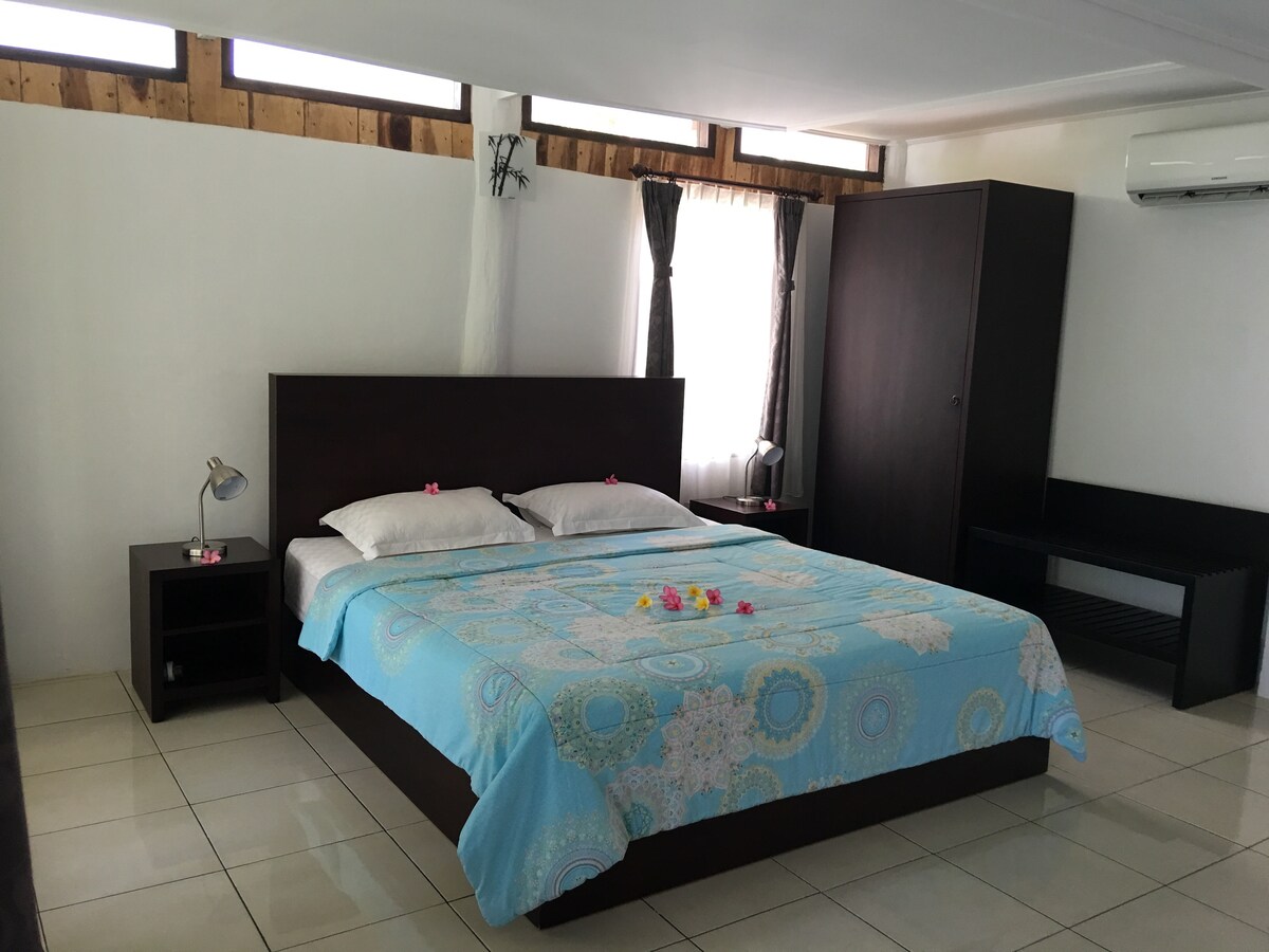 Our villa is only 100 steps away from a beautiful beach where you can take a long walk, a swim or sit waiting for the sun to set over Bali. We are only 7 minutes by car from tourist center of Senggigi where restaurants and bars are located and only 10 minutes away from the Harbour to the Gili islands . Our room is large and is air conditioned. You can enjoy breakfast at our pool side. Water dispenser is available with tea/instant coffee for you at anytime. Transportation is available 24 hours.