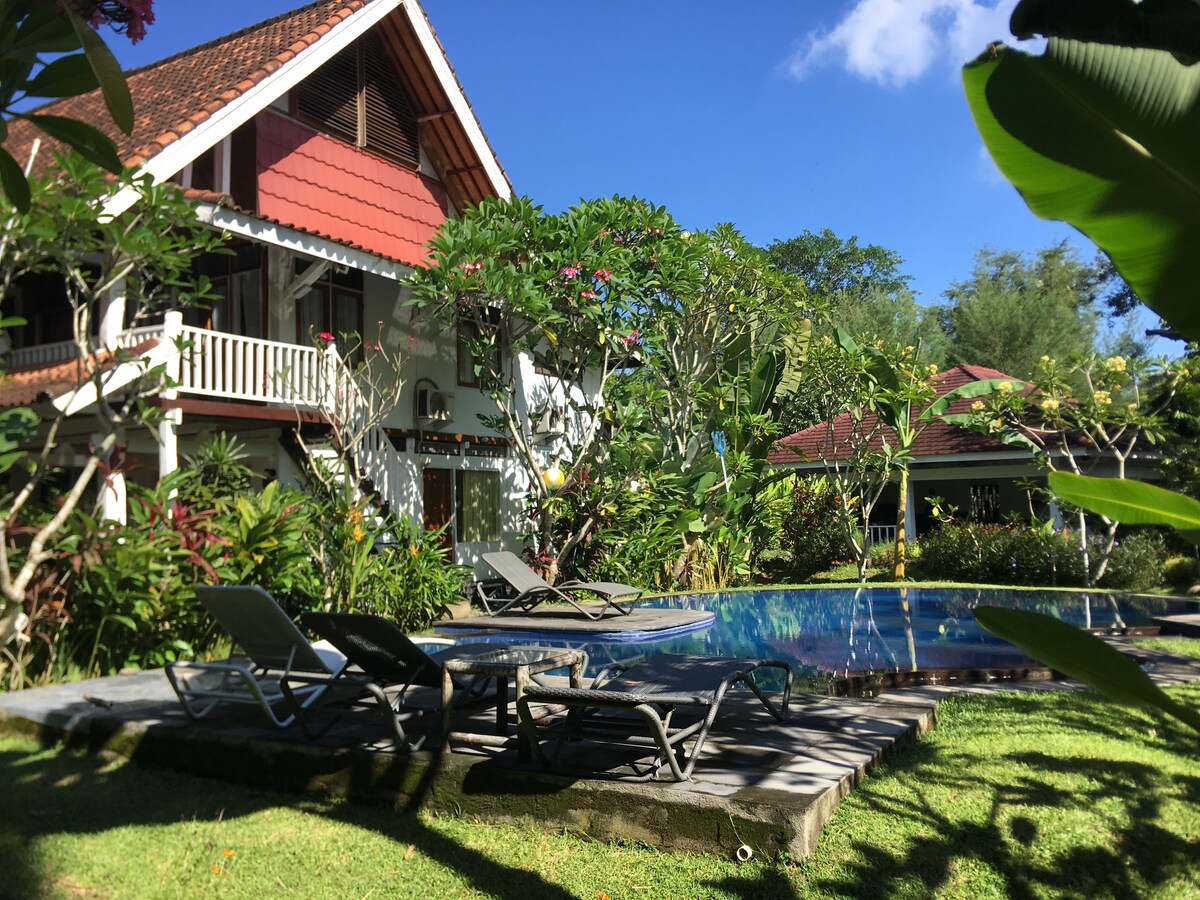 Our beautiful Villa is built in the tropical style with all the conveniences of modern living. You will stay in the whole house, with 3 en-suite bathrooms, AC and ocean views. Enjoy swimming in our secluded fresh water pool surrounded by leafy flower gardens. Take time to slow down and reflect, savour stunning bay views, enjoy island trips, diving, snorkelling and surfing. Stay and experience Desert Point, Kuta Beach and the 'Secret' Gilis. Unwind in our own restaurant/bar overlooking the bay.