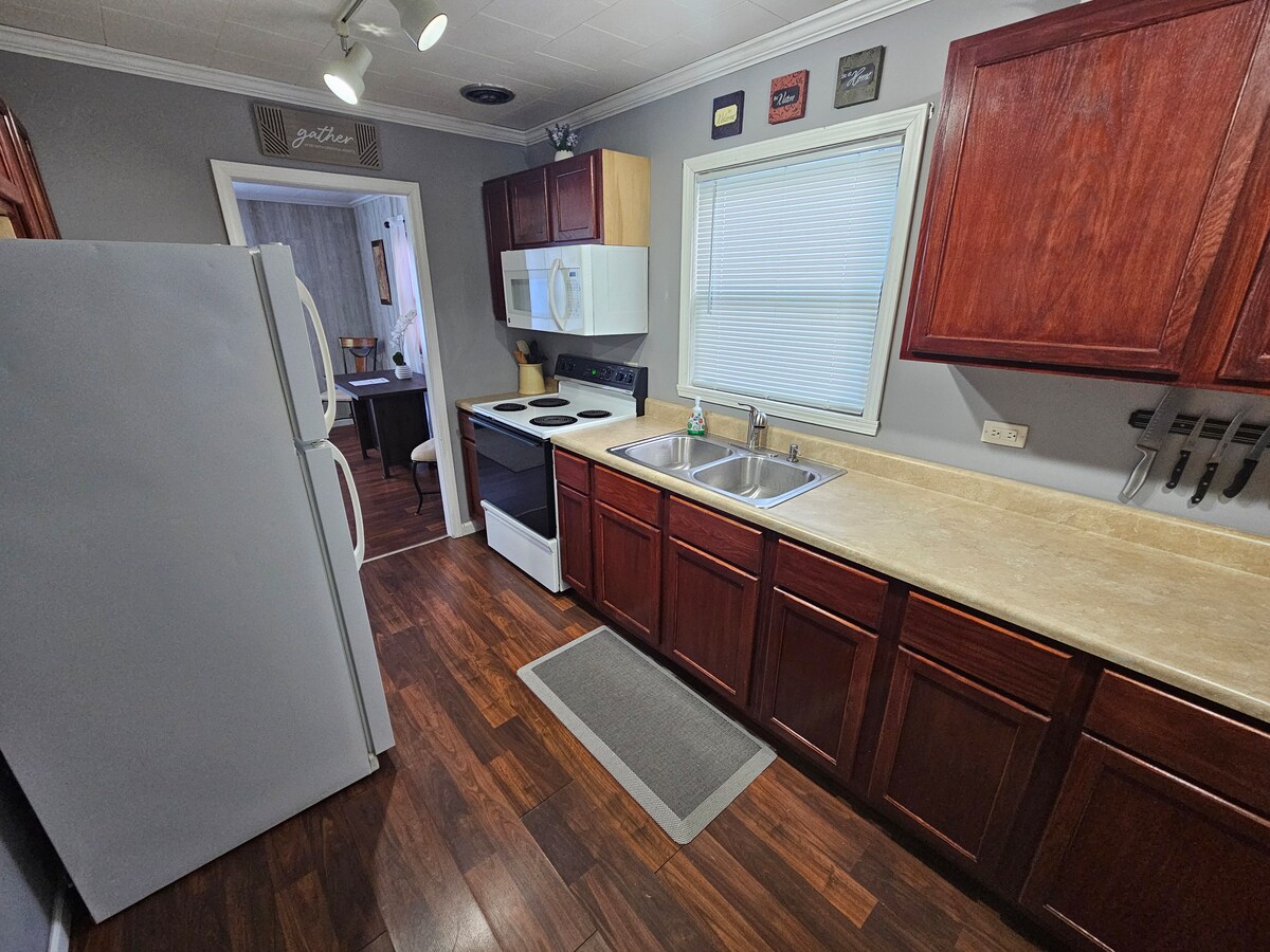 You will love our home. Read our reviews and see for yourself!! Enjoy a stylish experience at this centrally-located place. We offer a one bedroom and one bathroom house. The bedroom has a queen size bed and the sofa has a memory foam queen size pull out bed. We’ve added a desk in the dining room and a cute coffee bar in the kitchen. You can enjoy the enclosed front porch while relaxing in the rocking chairs. We have a full size washer and dryer located off of the kitchen .