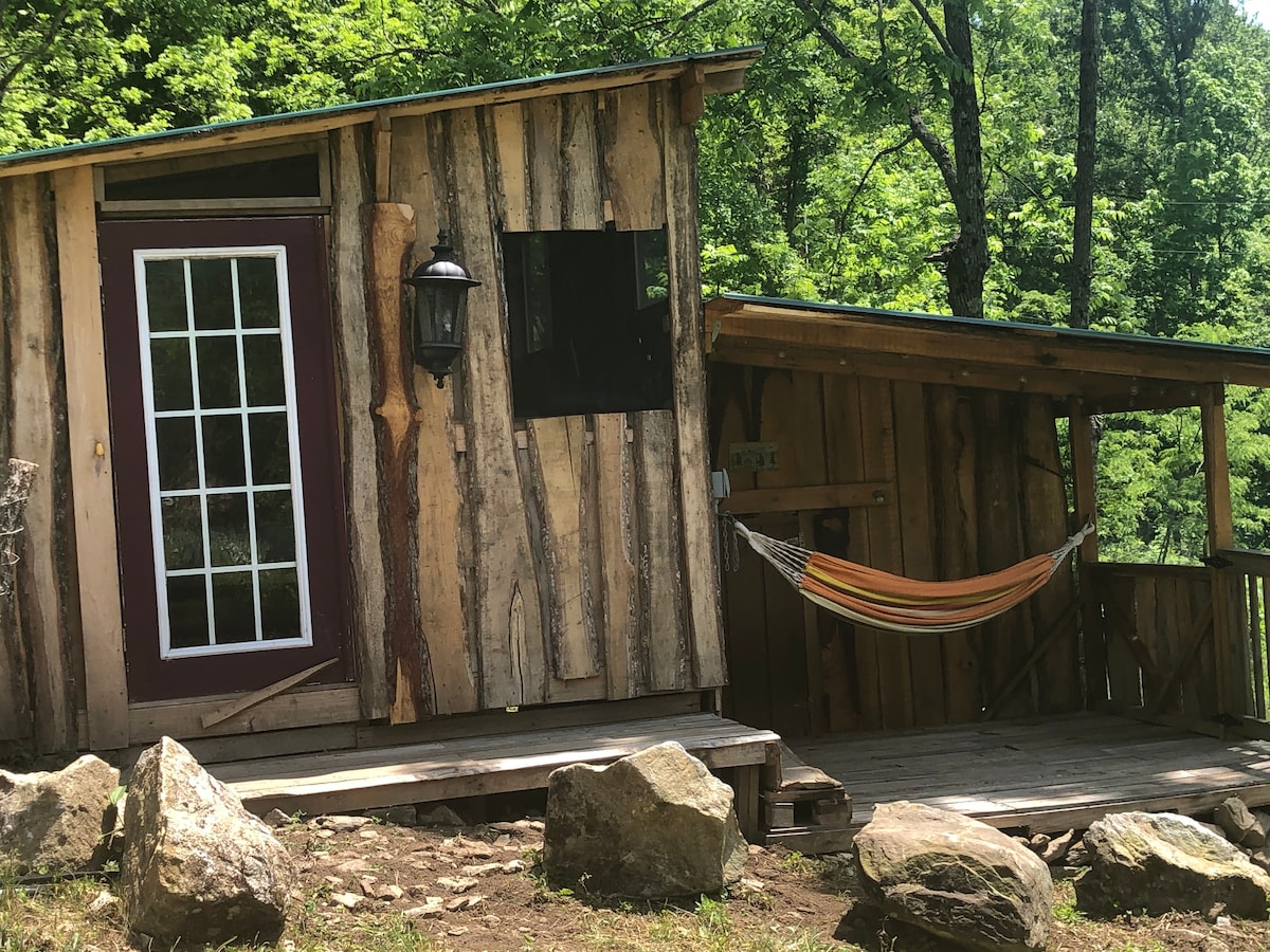 Hey Y'all!, we are offering a small shack (which was scheduled to be a portion our Boy Barn). It's 10x12 feet, furnished with a daybed with two twin mattresses. There is a retro DVD TV, mini refrigerator, microwave, coffee maker, and hot plate. Up our driveway and behind our home, you have use of an outdoor half bath and internet access. Behind the shack you have a private bonfire, hammock deck, a composting toilet and a covered area with a clay grill in an outdoor cooking area.