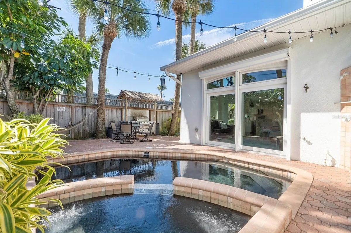 Welcome to your South Cocoa Beach retreat! Just two blocks from the ocean and steps from the Banana River. Enjoy free bikes, surfboards, beach gear, a hot tub on the enclosed porch, and classic arcade games inside. Relax on luxury reclining sofas and a comfortable king bed. Explore local shops and restaurants. BONUS: Access to a heated pool and huge game room just four blocks away—with free games, showers, and bathrooms. The perfect mix of fun, comfort, and coastal charm!