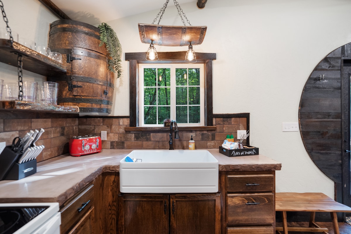 One of a kind Lord of The Rings themed Hobbit House. With hidden surprises around every turn. You won't be able to stop uncovering the small details that will add to your enjoyment of your stay. Almost everything in the house was custom made by the builder to add to the unique charm of the house. From the medieval doors with operable speak easy look throughs and the whiskey barrel cabinets, you don't want to miss putting this house on your travel bucket list.