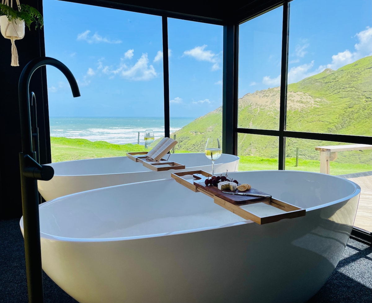 Feel your worries slip away as you journey through rolling green pastures to Coastal Acres Escape. Just 1.5 hours from the CBD and you’ve arrived. Pause for a moment. Take in a deep breath of sea air. You are standing on the deck. The Tasman sea stretches out below you between towering dune cliffs. The sun is getting low, casting a warm glow over the surrounding pastures. There is no one around. Just you and the horizon. Take a sip. Fire up the bbq. Enjoy dinner with the best view in the world.