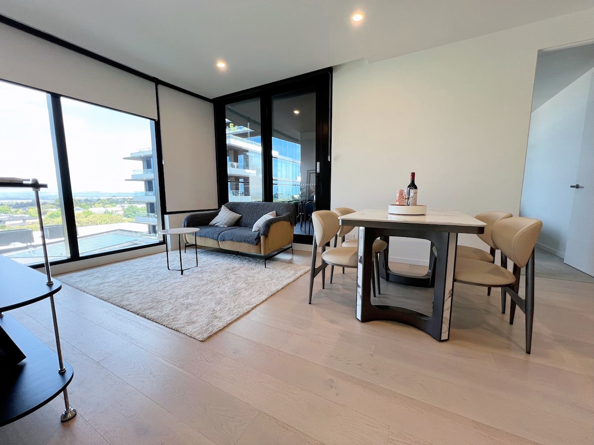 Bring the entire family to this amazing location, which boasts stunning views of the Dandenong Ranges and king size beds.All bedding is intimately covered in two layers, which is more hygienic and reassuring.You can freely choose between 1 twin bed room and 1 double room , or 2 double rooms and 1 sofa bed in the living room for extra guests. For the convenience of business travel, the facilities for indoor vacationing and leisurely shopping and dining are all provided.