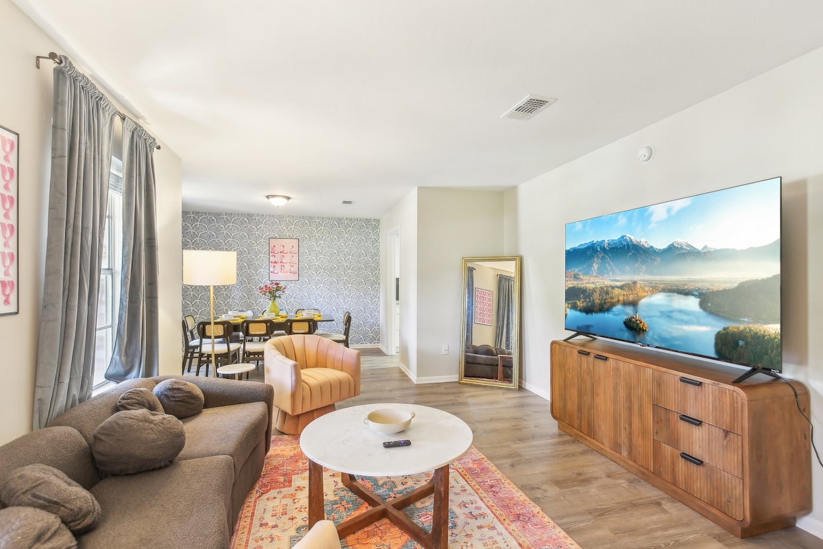 Relax in a brand new "Boho Modern" townhome located in the Historical Downtown Bryan & in walking distance to Ronin, Black Water Draw, RX Pizza, the Village, Cilantro, farmers market & many more Restaurants. Both bedrooms have king sized beds & master room/living room have 50 inch TVs. Log into your personal streaming account or use our Hulu, Disney+ or ESPN+, as a courtesy. Relax in private backyard or cook in the beautiful kitchen which includes a Keurig coffee maker with pods & creamers.