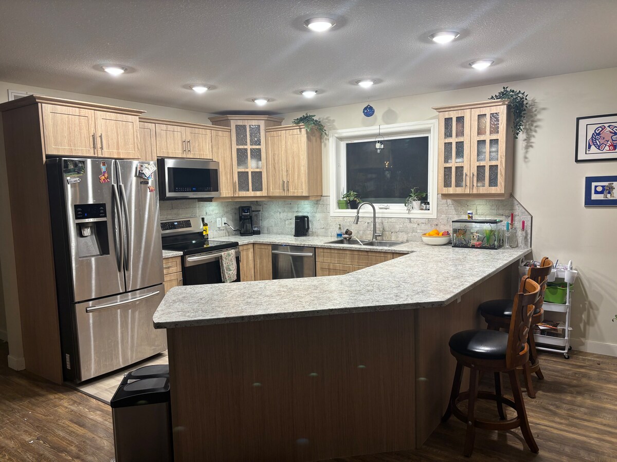 Come stay in this beautifully renovated two story bungalow with full basement. Little Blue has a fully equipped kitchen, three beautiful bedrooms with luxurious queen beds, main level office with cabinet queen bed if needed, a large and family friendly sectional in the basement for those movie nights and a great big backyard with view! Wake up and have coffee before you enjoy exploring Whitehorse and surrounding area then return "home" for a soak in the tub. We can't wait to hear from you.