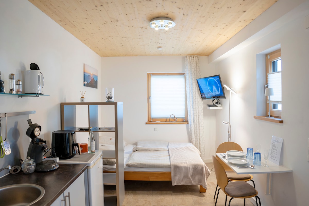 Modern vacation apartment for 2 people in the ecological wooden house on Lake Starnberg. The 50 sqm apartment with separate entrance has a spacious kitchen-living room with south-facing views of the forest edge, mountains and lake, a bedroom and a bathroom. In about 10 to 20 minutes you can walk to the Bernried Nature Park and the lakeshore with numerous dreamy swimming coves. A private parking space is available on the property. For bicycles, there is storage space.
