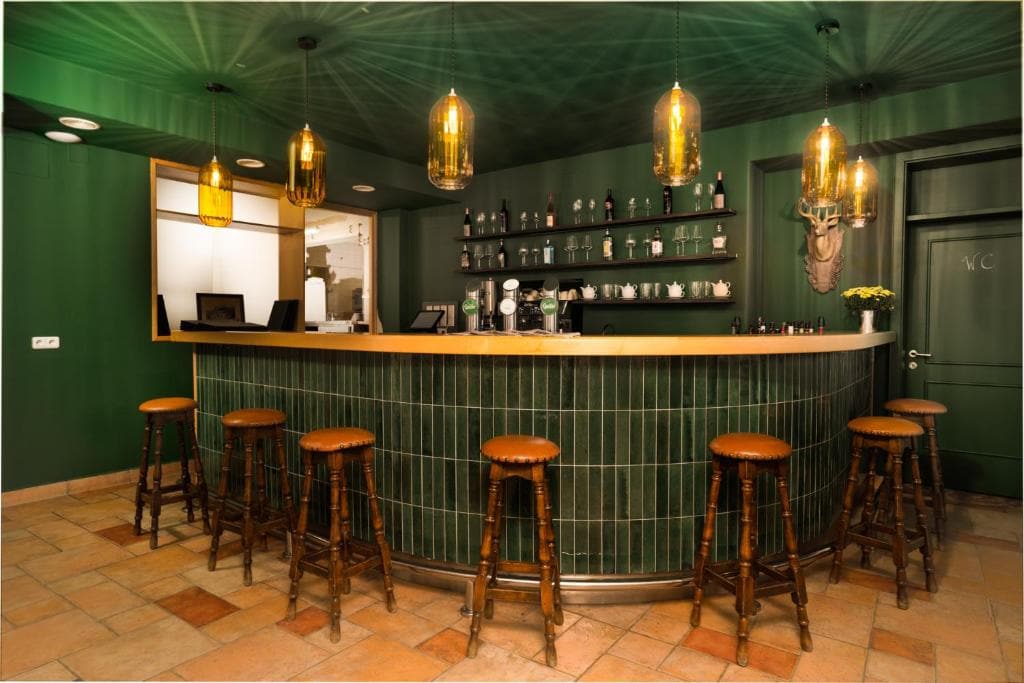 A rustic alpine hut is located amidst lush greenery, with the surrounding hills visible in the background. The structure features a sloped roof and wooden beams, blending harmoniously with the natural landscape. Dense forests provide a scenic backdrop, enhancing the serene setting.