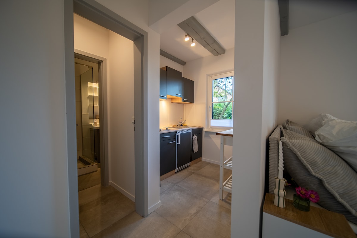 Luxury living in the old walls of the former Riddagshausen forester's lodge: In the evening, sit comfortably on the sheepskin in one of the wide window sills overlooking the park-like garden of the "Stadt-Land-Scheune" (city-country-barn). Enjoy the flickering light of the gas fireplace or cook with friends at the cooking island. Be enchanted architecturally by the room height and the impressive roof structure. Japanese shower toilet. Mattresses and pillow buffet by Tempur for sleeping like on clouds.