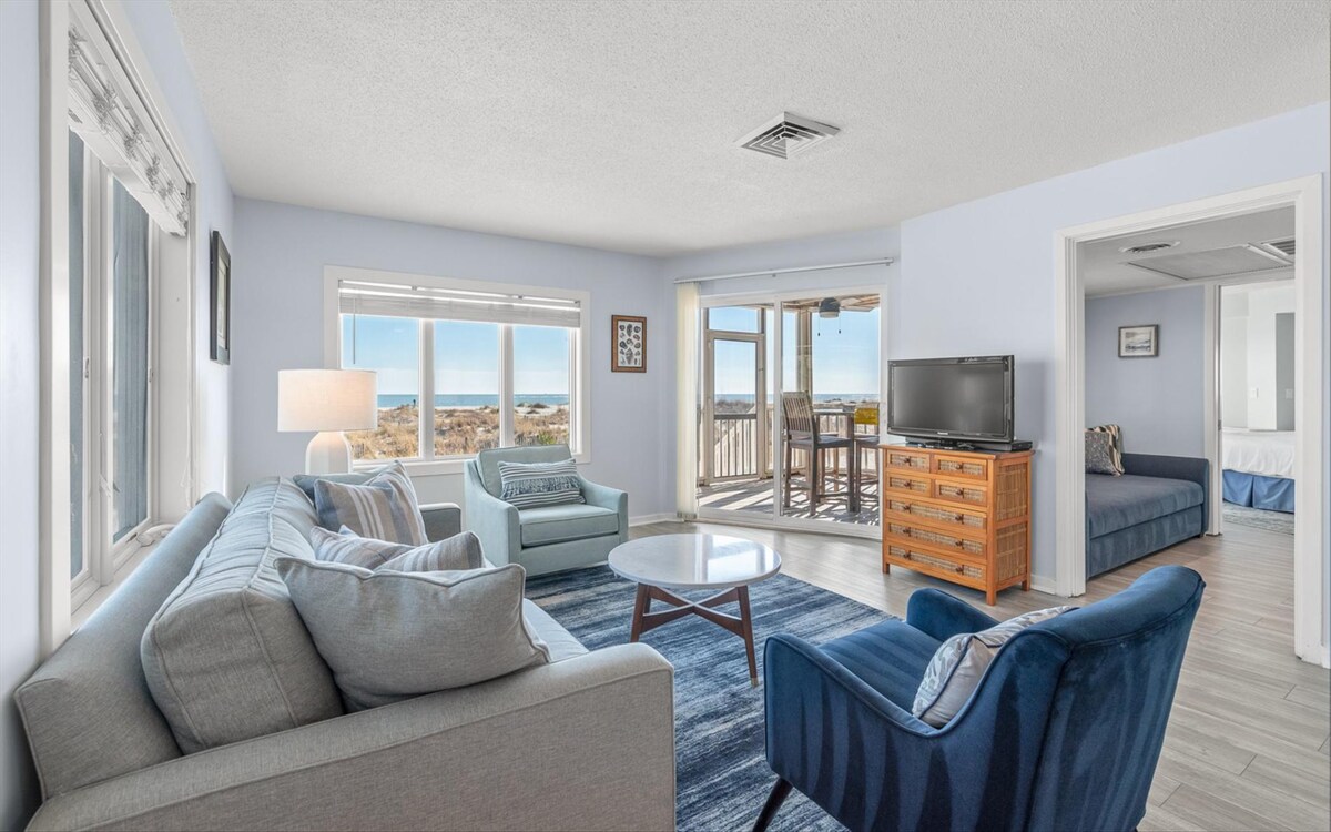 Enjoy breathtaking beachfront sunrises and dining at a cozy table on your own covered balcony. The private pier and pool are only steps away from the ocean. View stunning sunsets and Sullivan's Island Lighthouse from the bedroom and entrance. Nautical decor, premium vinyl plank floors, and shiplap walls coalesce within this bright apartment retaining an ethos of southern charm. The gourmet kitchen is well-equipped with full-size appliances, ice-maker, filtered water dispenser, granite countertop, under-counter lighting and a convenient coffee bar with multiple brew options! The panoramic ocean views are the best available at Sea Cabins! Located on the 3rd floor, it's just 3 doors from the end of building C. Enjoy beautiful sunrises right from the living room, kitchen, or balcony, and sunset views of Sullivan's Island Lighthouse from the front door or bedroom window. You will have private access to the beach, community pool, and fishing pier. Island shopping, restaurants, groceries and entertainment are just steps away! It is conveniently located near Mt. Pleasant, Shem Creek, and historic downtown Charleston, giving you unlimited choices for dining, shopping, and entertainment. This home sleeps 4 with a queen size bed and a queen sleeper sofa with memory foam mattress. Enjoy your meals at the bar or on the balcony. Outdoor grilling facilities and picnic tables are also available. The pool-house features private bathrooms and a coin-operated laundry. Access by stairs only (no elevator). Full Absentee host The apartment is located in Isle of Palms, a city on the slender barrier island of the same name. It’s known for its beaches backed by condos and eateries. Sea turtles nest in the area. A nearby park includes a beach, picnic areas, and a playground. Dining, shopping, and entertainment within walking distance. Only a short drive to historic Charleston, SC! Please be aware that the property has a Ring video doorbell on the premises (at the front door). There are no cameras/surveillance devices inside the home or on the balcony.