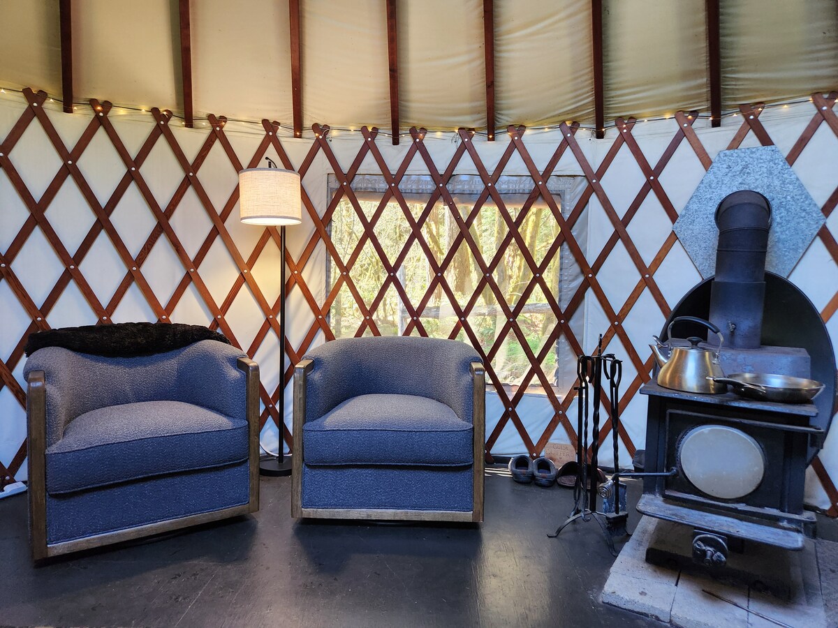 Ooh La La Romantic! 30' diameter Pacific Yurt w/open floor plan, skylight, wood stove, King Bed & fold out Queen Couch, TV w/DVD's, VHS's, CD player w/CDs, Roku, wi-fi, games, toys & puzzles! Kitchen/dishes & cook/serve-ware, gas stove/range, deep sink, drying rack, toaster, microwave & coffee maker. Table seats 4. BA w/Clawfoot Tub/Shower enclosure. New ductless heat + A/C in '23. Dogs welcome (2 max) w/pet fee; must be UTD on shots/flea control, socialized and potty trained. Read Rules.