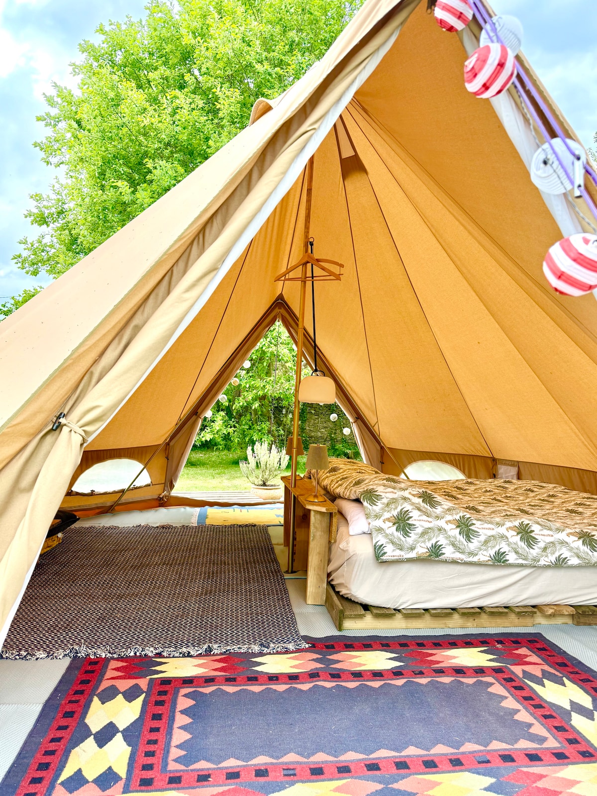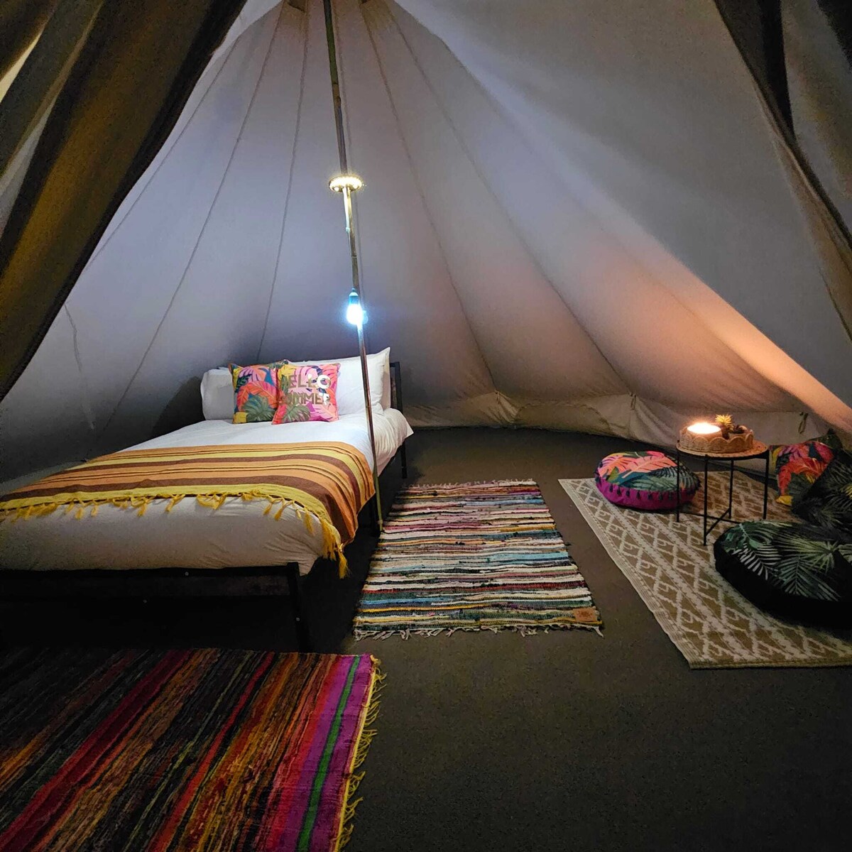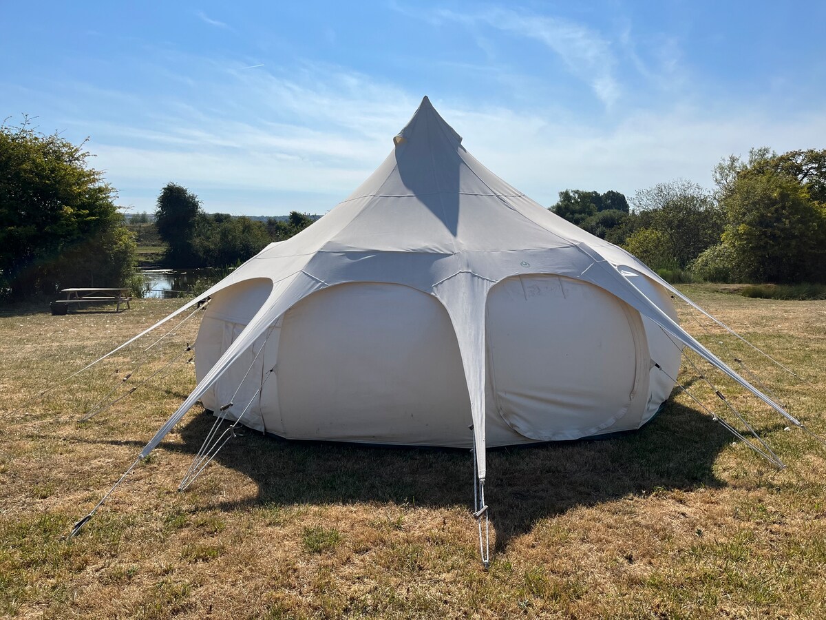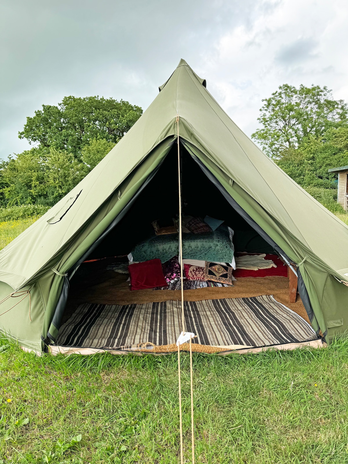 A charming bell tent. A budget friendly version of glamping. This large bell tent is unfurnished. Offering a hassle-free, comfortable, and time-saving camping experience, perfect for both beginners and seasoned campers looking to enjoy the great outdoors with minimal fuss. This is an unfurnished, the tent will already be erected upon your arrival, all you have to do is bring the rest of the camping equipment. It sleeps 2 to 4 guests.