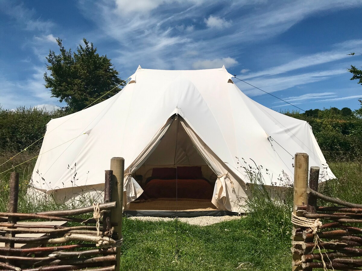 Our bell tent with super-king bed & luxurious bedding is perfectly located amidst wonderful countryside. There are many activities, places to see & events locally. Walks are directly from the tent. The local pub, serving home made food & local ales, is a 3-minute walk away. We provide an induction hob, fridge/freezer, BBQ, microwave, kettle & toaster. We can prepare 2 self-inflating mattresses for children if needed. The tent is on its own private area of land for you to use exclusively.