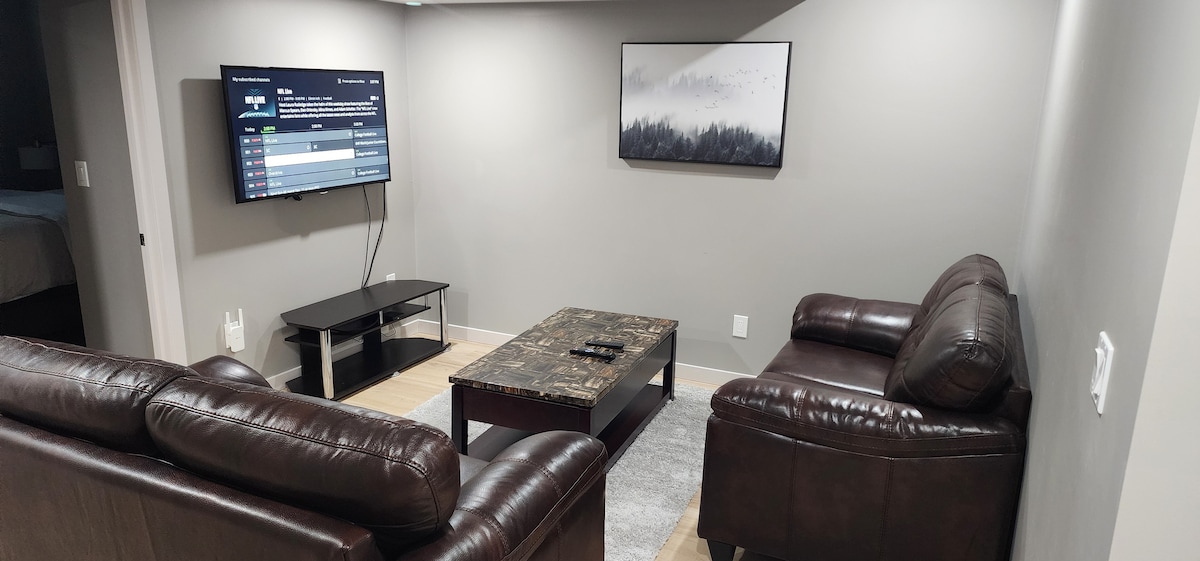 🏡 Key Features ✔️ Bright, spotless legal basement suite ✔️ 2 bedrooms with queen beds & hotel-style linens ✔️ Japanese-style futon for 5th guest only – extra use by request ✔️ Kitchen with milk Keurig coffee maker ✔️ Cozy living room with 58" Smart TV ✔️Stylish indoor hanging chair ✔️ Private entrance & easy self check-in ✔️ Free street parking or driveway spot 📍 Nearby ✔️ 2-min drive to shopping center ✔️ 15-min drive to Rabbit Hill Ski Resort ✔️ 20-min drive to YEG ✔️ 20-min drive to WEM