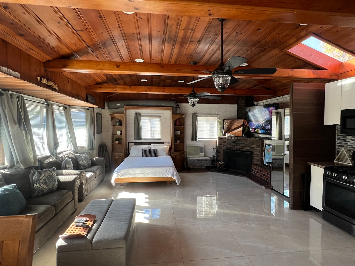 Rustic meets charming! Charming cabin feel in the city. Close to LAX, SoFi, Forum and Intuit. *Sleeps maximum of 6. SPACIOUS ZEN BATHROOM *Relax in Deep soaker tub *Shower for two with. *Large Marble floors, exposed brick walls and working fireplace, wood beams and ceiling. *Full kitchen, filtered H2O fridge, cook or reheat food, Dishwasher & Air fryer *Washer/Dryer *Binge shows/ with 75āTV Netflix, Prime, Disney *Workstation with WiFi *Make up Vanity š”