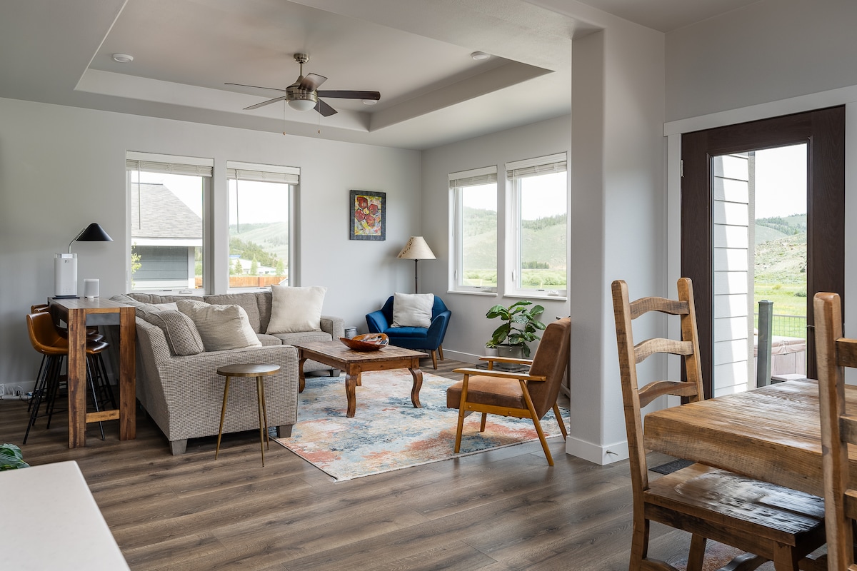Light, bright, and blissful, our newly built 2022 house is situated in Grand Elk, Granby. A large living room and kitchen space offers room for the whole family and for friends to hang out in. High-end appliances with a fully stocked kitchen is ready to make meals and memories. An outdoor patio with a hot tub and a grill are ready for use. Adventure and activities galore! 9 min from Granby Ski Resort, 25 mins from Winter Park, 10 mins from Lake Granby, and 30 mins from Rocky Mtn. Nat'l Park!