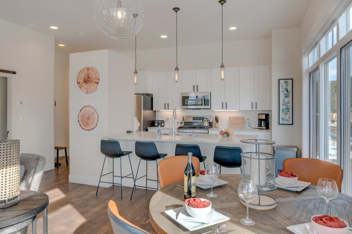 The perfect basecamp for mountain adventures! This cozy suite feels like a hotel room, with a full-sized Murphy bed. Only two bus stops from the slopes, with pickup right outside. After a day out, unwind in the hot tubs or relax on the couch with Roku streaming and games. You’ll also have a mini-fridge, microwave, toaster, coffee maker, and folding table with chairs. Right on Main Street—steps from Cooper Creek’s breweries, shops, and restaurants.