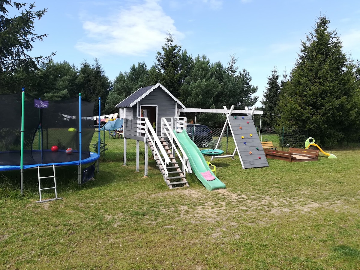 We invite you to rent 3 6-person cottages, located by the lake, just a few minutes walk from the beach. Peace, quiet, closeness to nature and beautiful views are a guarantee of a successful holiday. Each cottage is equipped with a fireplace, 55" TV, Wi-Fi, dishwasher, vacuum cleaner, fridge, oven, grill, and on the premises there are kayaks, bicycles and scooters, washing machine and electric dryer. Excellent conditions for fishing and relaxing by the lake. The perfect place to relax with family or friends!