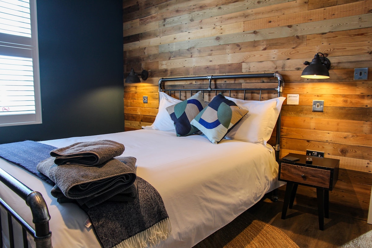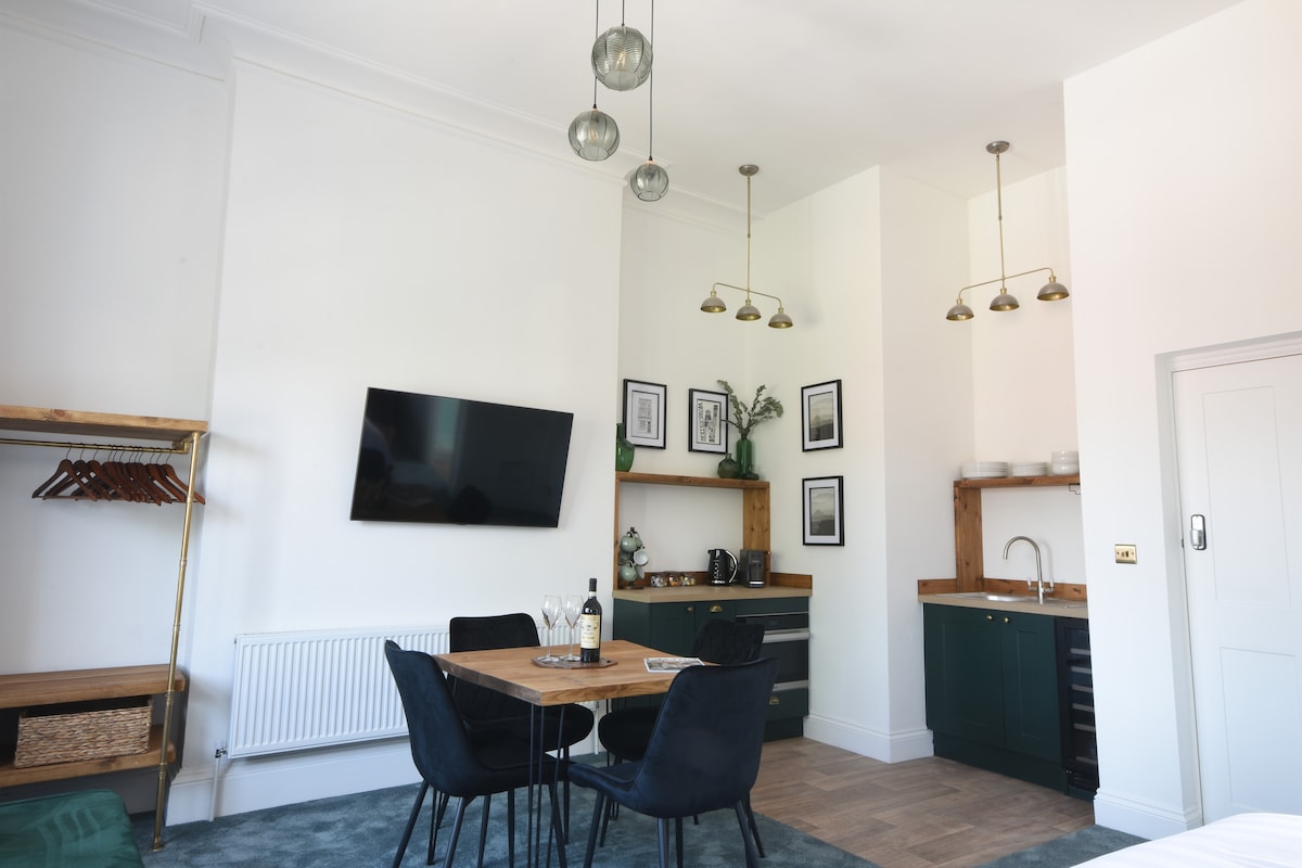 Our stylish Royalist apartment showcases an open concept kitchen & dining area with a stunning wallpaper mural, a cosy bedroom converted from a vault with eye-catching fret panel room dividers. The luxurious shower room & gorgeous Venetian plaster feature wall in the living space add a touch of sophistication. Throughout the apartment, you'll find modern, high-quality fixtures, fittings, and furnishings. Fully equipped Kitchen, Molton Brown Condiments, and full SKY SPORTS available for you.